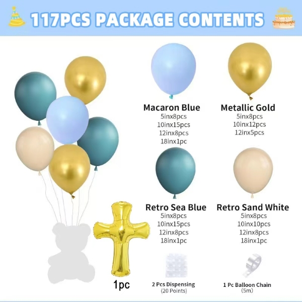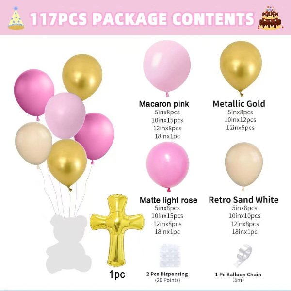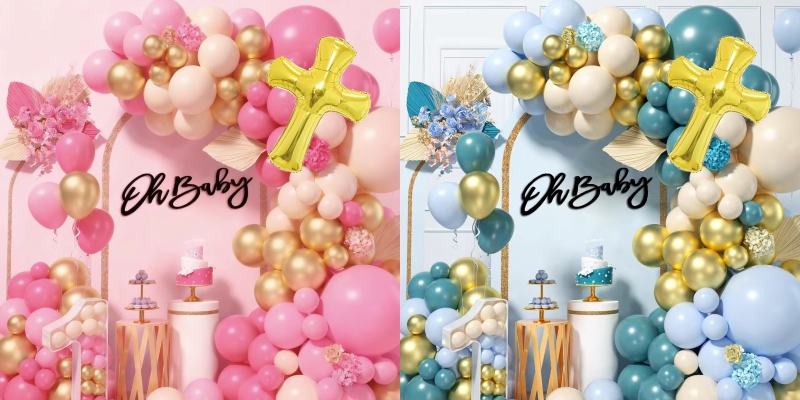 வளைகாப்பு பலூன் ஆர்ச் கிட்கள் இரண்டு பாணிகளைக் கொண்டுள்ளன, ஒரு பாணி பெண் குழந்தைகளுக்கானது மற்றும் ஒரு பாணி ஆண் குழந்தைகளுக்கானது. பெண் குழந்தை செட் மக்கரோன் பிங்க் கலர் பலூன், மேட் லைட் ரோஸ் கலர் பலூன், மேட் லைட் ஸ்கின் கலர் பலூன், மெட்டாலிக் கோல்ட் கலர் பலூன் மற்றும் கோல்ட் காட் பிளஸ் கிராஸ் ஆகியவற்றால் ஆனது. ஆண் குழந்தை செட் மேக்ரோன் நீல வண்ண பலூன், ரெட்ரோ கடல் நீல வண்ண பலூன், மேட் லைட் ஸ்கின் கலர் பலூன், மெட்டாலிக் கோல்ட் கலர் பலூன் மற்றும் கோல்ட் காட் பிளஸ் கிராஸ் ஆகியவற்றால் ஆனது. இரண்டுமே க்ளூ டாட் மற்றும் பலூன் ட்ரிப் ஆகியவற்றைக் கொண்டுள்ளன, அவற்றைப் பயன்படுத்தி முழு அழகான மாலையை உருவாக்கலாம்.