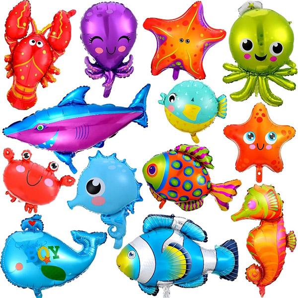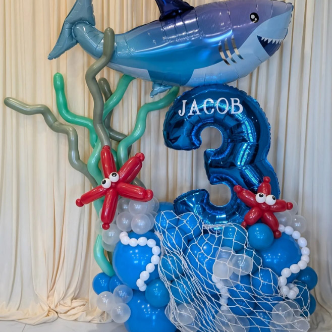 2. படலம் பலூன்:சுறா படலம் பலூன்களைக் கொண்ட பலூன் மாலையில், இந்த தொகுப்பில் சுறாக்கள், நட்சத்திர மீன்கள், ஜெல்லிமீன் மற்றும் கடல் குதிரைகள் போன்ற பல்வேறு கார்ட்டூன் கடல் உயிரினங்களுடன் படலம் பலூன்கள் பொருத்தப்பட்டுள்ளன. கூடுதலாக, சுறா படலம் பலூன்களுடன் ஒரு தனித்துவமான பலூன் மாலையை உருவாக்க உங்கள் வடிவத்தின் படி உங்களுக்காக தனிப்பயன் படலம் பலூன்களையும் நாங்கள் வடிவமைக்க முடியும்.