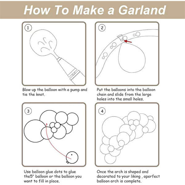 கவனம் மற்றும் எச்சரிக்கை:தயவு செய்து பலூன்களை அதிகமாக நிரப்ப வேண்டாம், மேலும் சூரிய ஒளி, அதிக வெப்பம், கூர்மையான பொருள் மற்றும் அதிகப்படியான உராய்வு ஆகியவற்றை தவிர்க்கவும். உங்கள் சிறந்த பலூன் அளவை அடைய ஒவ்வொரு பலூனிலும் காற்றின் அளவைக் கட்டுப்படுத்தவும், உங்கள் பலூன் கார்லண்ட் ஆர்ச் கிட் விருந்தை அனுபவிக்கவும்.