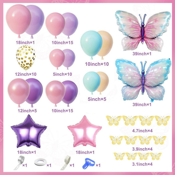 பட்டாம்பூச்சி பலூன் கார்லண்ட் கிட் முக்கியமாக லேடெக்ஸ் பலூன்களை உள்ளடக்கியது, அவை வெவ்வேறு அளவுகளில் (5 இன்ச், 10 இன்ச், 12 இன்ச் மற்றும் 18 இன்ச்) வருகின்றன. அவற்றின் நிறங்கள் பொதுவாக இளஞ்சிவப்பு, நீலம், ஊதா போன்றவற்றால் ஆதிக்கம் செலுத்துகின்றன. கிட்டின் அடுக்கு விளைவை அதிகரிக்க, நீங்கள் வெளிப்படையான லேடக்ஸ் பலூன்கள் மற்றும் கான்ஃபெட்டி லேடெக்ஸ் பலூன்களையும் பார்க்கலாம். கிட்டின் கருப்பொருளாக, பட்டாம்பூச்சி படலம் பலூன்களும் இன்றியமையாதவை. அவற்றின் நிறங்களில் பெரும்பாலானவை பிரகாசமானவை (நீலம்/இளஞ்சிவப்பு/ஊதா...), மற்றும் சராசரி அளவு 18-30 அங்குலங்கள் (தனிப்பயன் அளவுகள் உள்ளன). கூடுதலாக, அவர்கள் மிகவும் யதார்த்தமான தோற்றத்தைக் கொண்டுள்ளனர், அது கிட்டத்தட்ட உயிரோட்டமானது.
