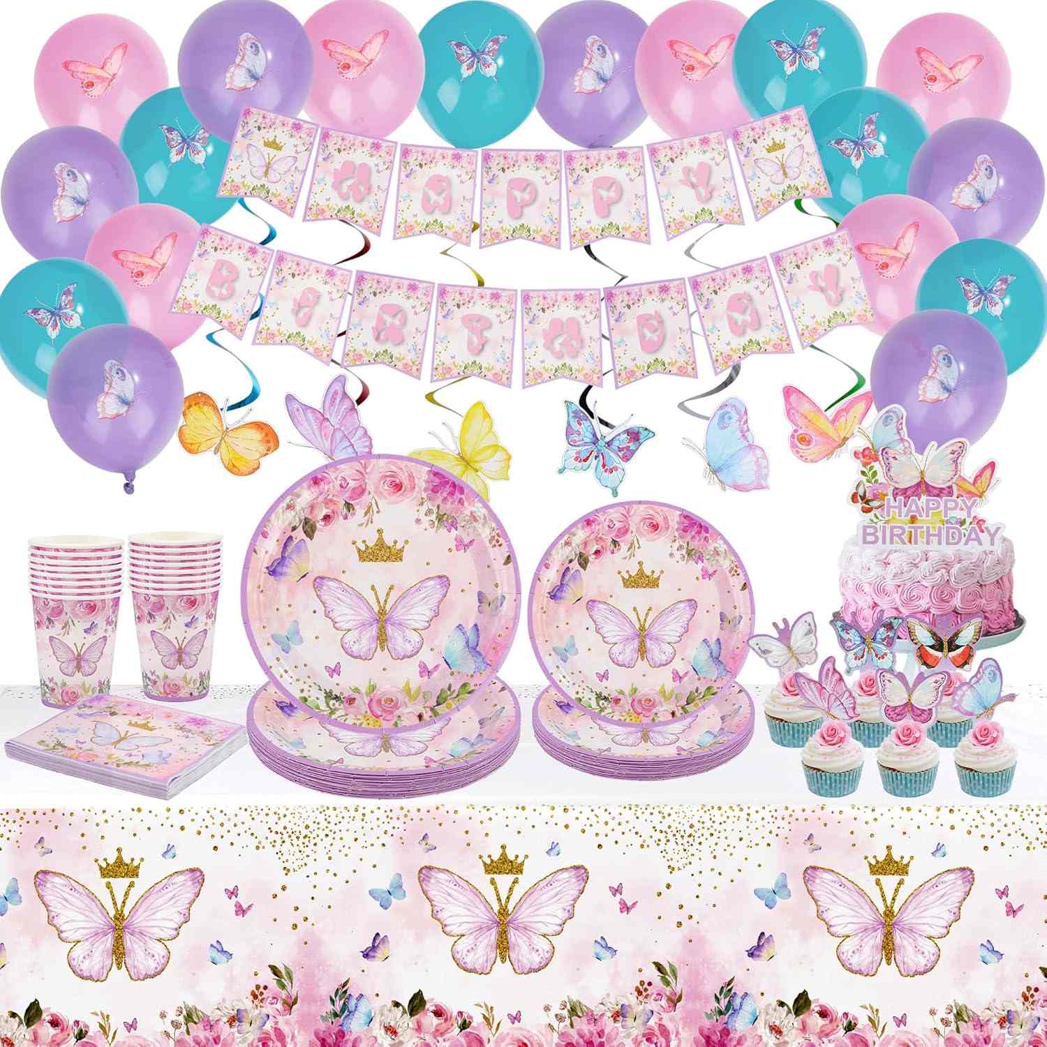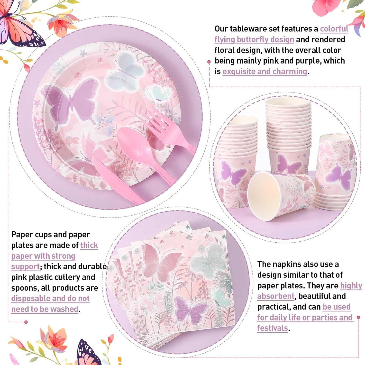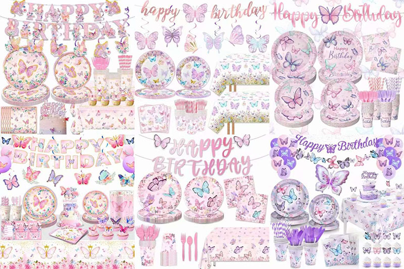 பார்ட்டி அலங்காரத்திற்கான ஒரு சிறந்த விருப்பம் பட்டாம்பூச்சி பார்ட்டி டேபிள்வேர் செட் ஆகும். நாப்கின்கள், காகிதத் தட்டுகள், காகிதக் கோப்பைகள், முட்கரண்டிகள் மற்றும் கத்திகள் ஆகியவை அடங்கும். ஒவ்வொரு பகுதியும் பட்டாம்பூச்சிகளின் பாகங்களைக் காட்டுகிறது.