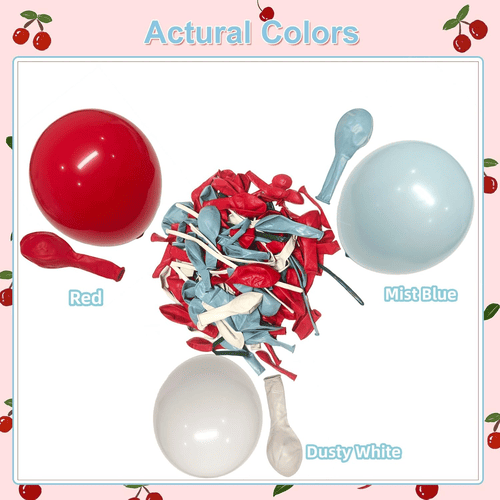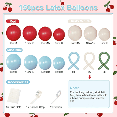 செர்ரி ப்ளாசம் பலூன் வளைவு பல்வேறு லேடெக்ஸ் பலூன்களுடன் வருகிறது, இதில் ரவுண்ட் லேடெக்ஸ் பலூன் மற்றும் நீண்ட லேடக்ஸ் பலூன் ஆகியவை அடங்கும். கிட்டின் மொத்த பாணி நேர்மறையாகவும் அழகாகவும் இருக்கிறது, இது உலகம் முழுவதும் உள்ள வாடிக்கையாளர்களால் விரும்பப்பட்டது. வட்ட லேடெக்ஸ் பலூனின் நிறங்கள் சிவப்பு, தூசி நிறைந்த வெள்ளை மற்றும் மூடுபனி நீலம். மற்றும் நீண்ட லேடெக்ஸ் பலூன் மூடுபனி நீலம், தூசி நிறைந்த வெள்ளை மற்றும் பச்சை நிறத்தில் உள்ளது, நீண்ட லேடெக்ஸ் பலூன்கள் வில் டை பாணி மற்றும் செர்ரி பாணியை உருவாக்க பயன்படுத்தப்படுகின்றன.