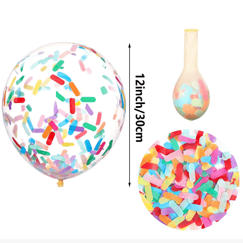 கான்ஃபெட்டி பலூன்கள் வழக்கமாக 12 இன்ச் வெளிப்படையான லேடெக்ஸ் பலூன்களைப் பயன்படுத்துகின்றன. இந்த அளவிலான கான்ஃபெட்டி பலூன்கள் அடிக்கடி பயன்படுத்தப்படுகின்றன மற்றும் சிறிய பலூன் சூட்கள் அல்லது பலூன் ரீத் கிட்களில் சிறந்த பலன்களைப் பெறுகின்றன.
