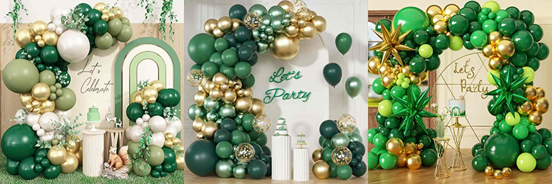 மேட் பச்சை, அடர் பச்சை மற்றும் பிற பச்சை பலூன்கள் தங்கத்துடன் கலக்கும்போது, பச்சை நிறத்தின் வெவ்வேறு நிழல்கள் ஒரு காடுகளின் வாழ்க்கையைப் போலவும், வளைவில் கைப்பற்றப்பட்ட பழங்கால நேர்த்தியாகவும் உணர்கிறது. தங்கம் சூரிய ஒளியைப் போல பிரகாசிக்கிறது, முழு நிறத்தையும் பிரகாசமாக்குகிறது. மாறிவரும் பச்சை வளைவை உற்சாகமாக வைத்திருக்கிறது, மேலும் உலோகத் தங்கம் பச்சை நிறத்தின் கனத்தை மென்மையாக்குகிறது. பல ரெட்ரோ பார்ட்டி காட்சிகளுக்குப் பொருந்தி இயற்கையாகவும், பணக்காரராகவும், ஆடம்பரமாகவும் இருக்கிறது.