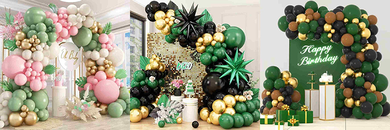 நீங்கள் பச்சை மற்றும் தங்க பலூன் வளைவுடன் வெள்ளை அல்லது பேரிக்காய் வெள்ளை நிற பலூன்களைப் பயன்படுத்தலாம். இது மென்மையாகவும், சூடாகவும், வசந்த தோட்டத்தின் புத்துணர்ச்சியைப் பெறுவதற்கு ஒத்ததாகவும் மாறும்; இளஞ்சிவப்பு நிற பலூன்களுடன் இணைக்கப்பட்டால், அது வளைகாப்பு இல்லாமல் இனிமையாக இருக்கும் ஒரு துடிப்பான உணர்வை உருவாக்கலாம், வளைகாப்பு மற்றும் பெண்-கருப்பொருள் கொண்ட பார்ட்டிகளில் காதல் சூழ்நிலையை புகுத்தும்; கருப்பு மற்றும் பழுப்பு, பச்சை மற்றும் தங்க நிறங்கள் போன்ற ஆழமான வண்ணங்களுடன் இணைந்தாலும் கூட, அந்த வண்ணங்களின் ஆழம் மற்றும் நிலைத்தன்மையை அதன் வேலைநிறுத்தம் கொண்ட வண்ண பதற்றத்துடன் சமன் செய்து, நவீன மற்றும் சூடான கொண்டாட்ட சூழ்நிலையை உருவாக்குகிறது.