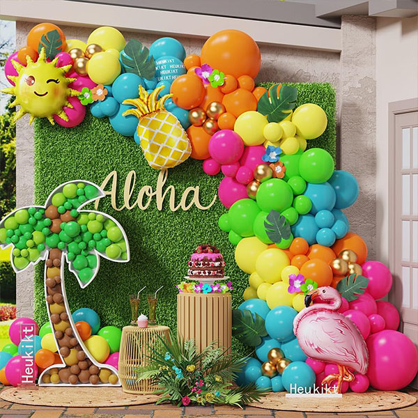 உங்களுக்கான தனித்துவமான வண்ணத் தட்டுகளைத் தேர்ந்தெடுத்து, உங்கள் சொந்த கருப்பொருளுக்கு நாங்கள் தனிப்பயனாக்கலாம். எடுத்துக்காட்டாக, சில ரெட்ரோ-தீம் பலூன்களைச் சேர்ப்பது வெப்பமண்டல மற்றும் பண்டிகை சூழ்நிலையை உங்கள் இடத்திற்கு உருவாக்கும், மேலும் உங்கள் ஹவாய் பலூன் கார்லண்ட் கிட்டில் கவர்ச்சியை சேர்க்கும்.