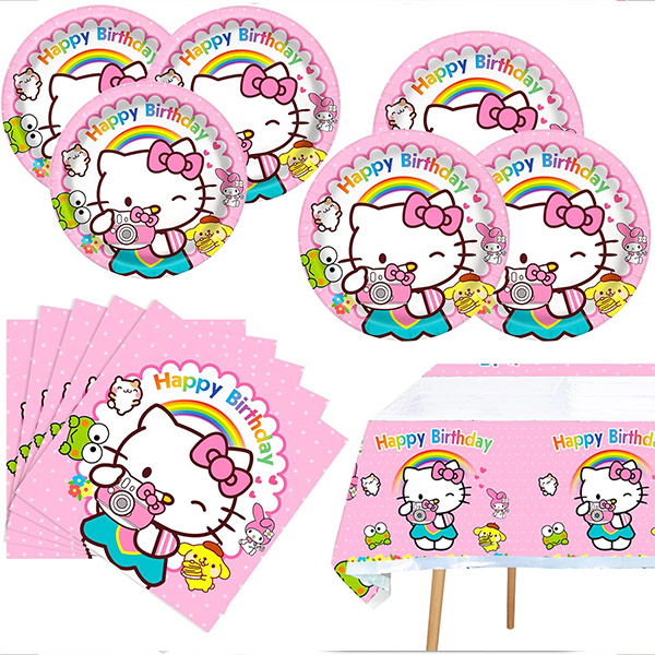 3) டேபிள்வேர்: ஹலோ கிட்டி டேபிள்வேர், உங்கள் பார்ட்டிக்கு அழகான சூழலை உருவாக்கும் வகையில் அமைக்கப்பட்டுள்ள இளஞ்சிவப்பு மற்றும் வெள்ளை பார்ட்டி சப்ளைகளின் தனித்துவமான வடிவமைப்புகளுடன் இன்னும் இணைக்கப்படலாம். அனைத்து தயாரிப்புகளும் மிகவும் நீடித்தவை, பிரகாசமான வண்ணம் மற்றும் உயர்தர உணர்வைக் கொண்டுள்ளன.