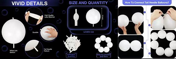 இது ஒரு பிறந்தநாள் விழா, திருமண, கொண்டாட்டம் அல்லது வேறு எந்த சந்தர்ப்பத்திலும், அதே வண்ணத்தின் பலூன்களை அல்லது பிற வண்ணங்களை இணைப்பதன் மூலம், நீங்கள் விரும்பும் நேர்த்தியான சூழ்நிலையை உருவாக்கலாம். அவை ஆண்டுவிழாக்கள், ஹாலோவீன், குழந்தை வரவேற்பு விருந்துகள், கிறிஸ்துமஸ் விருந்துகள் அல்லது வேறு எந்த நிகழ்விற்கும் சரியான அலங்காரங்களாக இருக்கும். இணைப்பு பலூன்கள் ஒரு தனித்துவமான சூழ்நிலையை உருவாக்குவதற்கும் கவனத்தை ஈர்ப்பதற்கும் சிறந்த தேர்வுகள்.