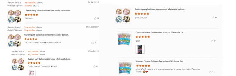 தொகுப்பிற்கு ஒரு உலோக நிறத்தை நீங்கள் தேர்ந்தெடுக்கலாம். பிரபலமான விருப்பங்கள் ஷாம்பெயின் தங்கம், உலோக பச்சை, ரோஜா தங்கம் மற்றும் பல. இது உங்கள் காட்சியை எளிமையாகவும் ஒன்றாகவும் உணர வைக்கிறது. இது நன்றாக நீண்டுள்ளது. அது அரிதாகவே வெளிவருவதில்லை. பணவீக்கத்திற்குப் பிறகு 12 மணி நேரத்திற்கும் மேலாக நிரம்பியிருக்கும். நீங்கள் வெவ்வேறு உலோக நிழல்களையும் கலக்கலாம். தங்கம் மற்றும் வெள்ளியை ஒன்றாக முயற்சிக்கவும். இது அடுக்கு, கண்கவர் அலங்காரத்தை உருவாக்குகிறது. இந்த பலூன்களை கான்ஃபெட்டி லேடெக்ஸ் பலூன்களுடன் இணைக்கவும். உலோக பலூன்களின் மிருதுவான பிரகாசம், கான்ஃபெட்டியின் பளபளப்பான அமைப்புடன் முரண்படுகிறது. நீங்கள் அவற்றை அசைக்கும்போது கான்ஃபெட்டி உள்ளே நகர்கிறது. இது எந்த இடத்திற்கும் வேடிக்கையையும் இயக்கத்தையும் சேர்க்கிறது. உலோக வண்ண பலூன்கள் சிறிய செட் பிறந்தநாள் விழாக்கள், திருமணங்கள், விடுமுறை நிகழ்வுகள் மற்றும் ஸ்டோர் சாளர காட்சிகளுக்கு வேலை செய்கின்றன. ஒவ்வொரு தொகுப்பும் கடுமையான காற்று இறுக்கம் மற்றும் பாதுகாப்பு சோதனைகளை கடந்து செல்கிறது. இது EN71 மற்றும் CE போன்ற சர்வதேச தரநிலைகளை சந்திக்கிறது. அவற்றை உயர்த்துவது எளிது. DIY புதியவர்கள் கூட அவற்றைப் பயன்படுத்தலாம். அவர்கள் தொழில்முறை நிகழ்வு திட்டமிடுபவர்களால் விரும்பப்படுகிறார்கள். அற்புதமான சூழ்நிலையுடன் கூடிய இடத்தை உருவாக்குவீர்கள்.