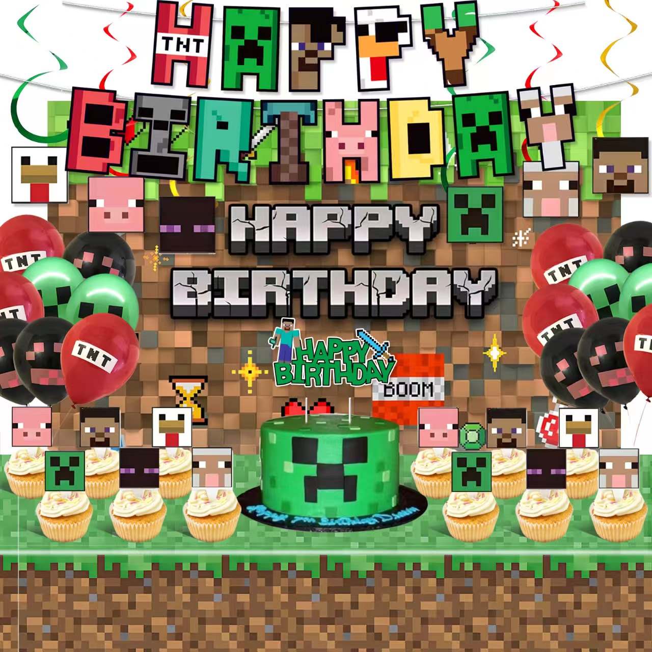 உருப்படிகள் தீம் மூலம் பொருந்தலாம். Minecraft அட்டவணை துணி ஒரே பாணி டேபிள்வேர் உடன் செல்லலாம். Minecraft அட்டவணை துணி ஒரே பாணி பின்னணியுடன் செல்லலாம். Minecraft அட்டவணை துணி ஒரே பாணி பேனருடன் செல்லலாம். இந்த தொகுப்பு பச்சை லேடெக்ஸ் பலூன்களை சேர்க்கலாம். இந்த தொகுப்பு பழுப்பு நிற லேடெக்ஸ் பலூன்களைச் சேர்க்கலாம். தொகுப்பு பிக்சல் படலம் பலூன்களை சேர்க்கலாம். கட்சி ஒரு தொகுதி உலகம் போல் தெரிகிறது.