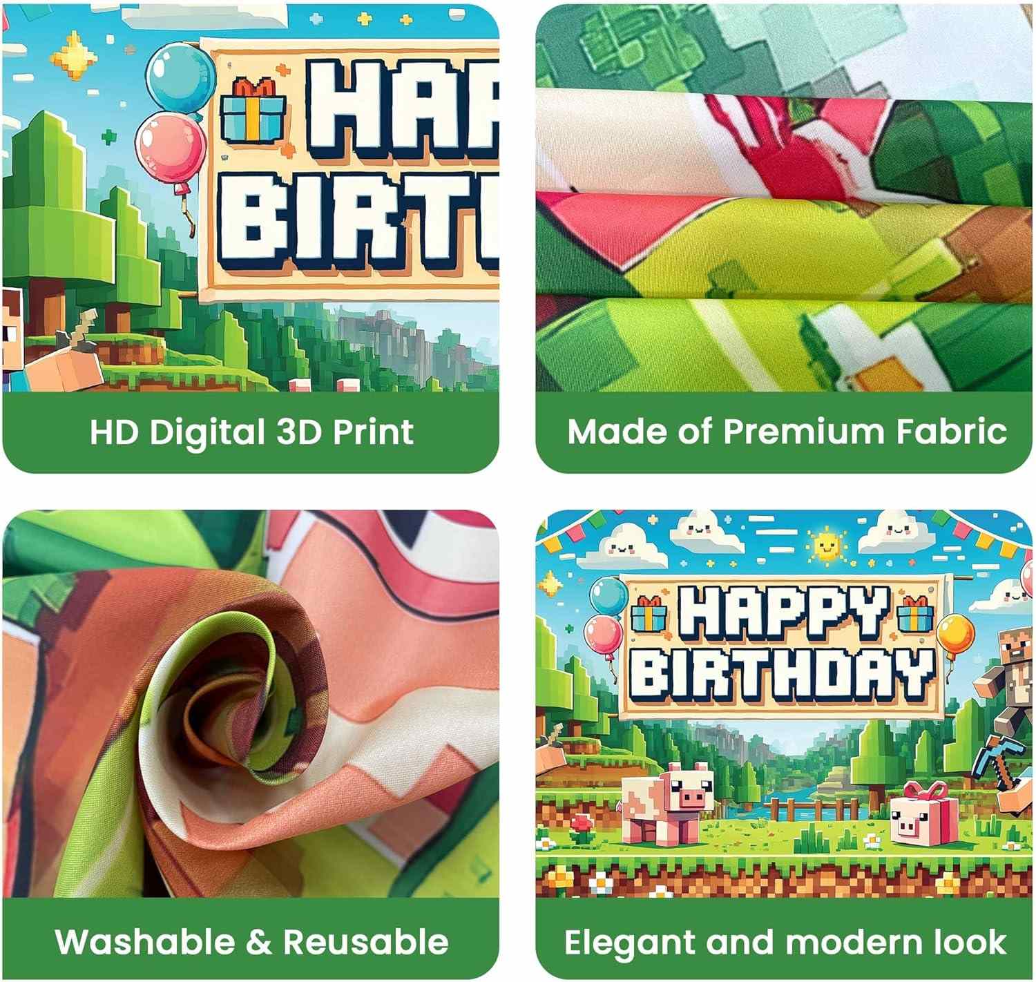 ஒவ்வொரு தயாரிப்பும் Minecraft பாகங்களை அச்சிடலாம். வடிவமைப்பு புல், அழுக்கு தொகுதிகள், பிக்சல் வானம் மற்றும் பலவற்றைக் காட்டலாம். வடிவமைப்பு சொற்களைச் சேர்க்கலாம். வார்த்தைகள் பிறந்தநாள் வாழ்த்துக்கள் அல்லது விருந்து நேரம். கட்சியின் மனநிலை வலுவாக தெரிகிறது.