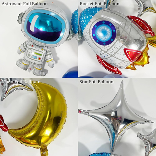 படலம் பலூன்களில் விண்வெளி வீரர்கள், ராக்கெட்டுகள், பறக்கும் தட்டுகள் மற்றும் பிற பாணிகள் உள்ளன, அவை இந்த மாலைக்கு நிறைய ஆர்வத்தையும் யதார்த்தத்தையும் சேர்க்கின்றன.