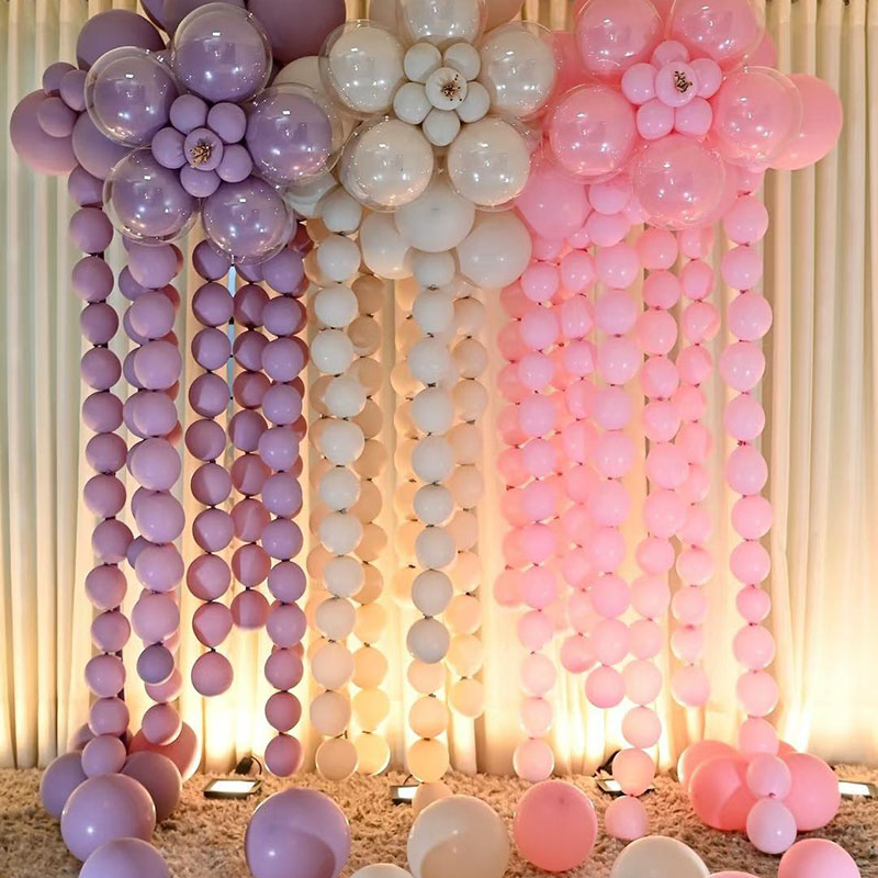வணிக அலங்காரத்திற்கு ஏற்றது (இரவு சந்தை ஸ்டால்கள் மற்றும் கட்சி திட்டமிடல் போன்றவை). வால் வடிவமைப்பு பலூன்களை விரைவாக சரம் செய்ய அனுமதிக்கிறது, நேரத்தை மிச்சப்படுத்துகிறது. வணிக நிகழ்ச்சிகளுக்கு, 10 அங்குல பலூனைத் தேர்வு செய்ய பரிந்துரைக்கிறோம். அதன் நெகிழ்ச்சி மற்றும் நெகிழ்வுத்தன்மை ஆகியவை மீன் மற்றும் டிராகன்கள் போன்ற சிக்கலான வடிவங்களை உருவாக்குவதற்கு ஏற்றதாக அமைகின்றன, மேலும் இது வெடிக்கும் வாய்ப்பு குறைவு. உயர்த்துவதற்கு முன், சேதத்திற்கு பலூனை சரிபார்க்கவும். அதிகப்படியான நிரப்புதலைத் தவிர்க்கவும் (சுமார் 80%) மற்றும் அதன் மிதக்கும் நேரத்தை நீடிப்பதற்கு நேரடி சூரிய ஒளியைத் தவிர்த்து கூர்மையான பொருள்களுடன் தொடர்புகொள்வதைத் தவிர்க்கவும். லேடெக்ஸ் வயதானதைத் தடுக்க பயன்படுத்தப்படாத பலூன்களை சீல் செய்யப்பட்ட, உலர்ந்த, குளிர்ந்த இடத்தில் சேமிக்கவும். அடுத்த பயன்பாட்டிற்கு முன் நெகிழ்ச்சித்தன்மையை சோதிக்கவும்.