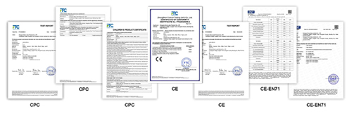 எங்களின் முழு அளவிலான தயாரிப்புகள் CPC,CE,EN71 மற்றும் பிற அங்கீகரிக்கப்பட்ட சான்றிதழைக் கடந்து, ஐரோப்பிய மற்றும் அமெரிக்க மற்றும் பிற இலக்கு சந்தை பாதுகாப்பு விதிமுறைகளுடன் கண்டிப்பாக இணங்கியுள்ளன. இந்த தகுதிகள் உங்கள் பொருட்களை சுங்கத்தை சீராக அழிக்கவும் வெளிநாட்டு சந்தைகளில் இணக்க அபாயங்களை முற்றிலும் தவிர்க்கவும் உதவும்.