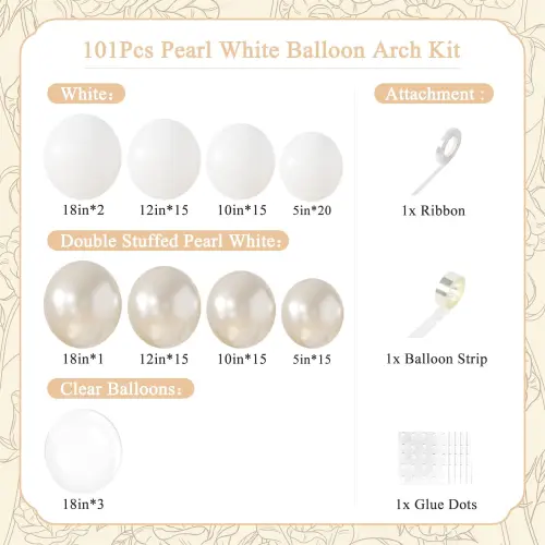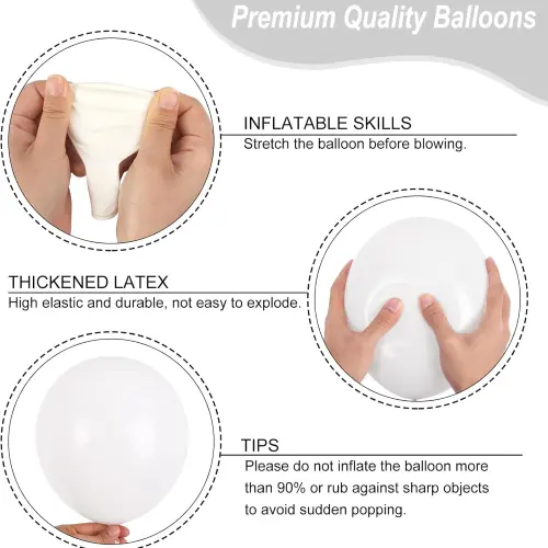 ஒவ்வொரு வெள்ளை திருமண பலூன் வளைவிலும் பலூன் புள்ளிகள், பலூன் துண்டு, ரிப்பன், பலூன் டைகள் உள்ளன. அனைத்து கவனமாக ஒரு அழகான மற்றும் ஒத்திசைந்த திருமண அலங்காரம் விளைவு உருவாக்க பொருந்தும்.